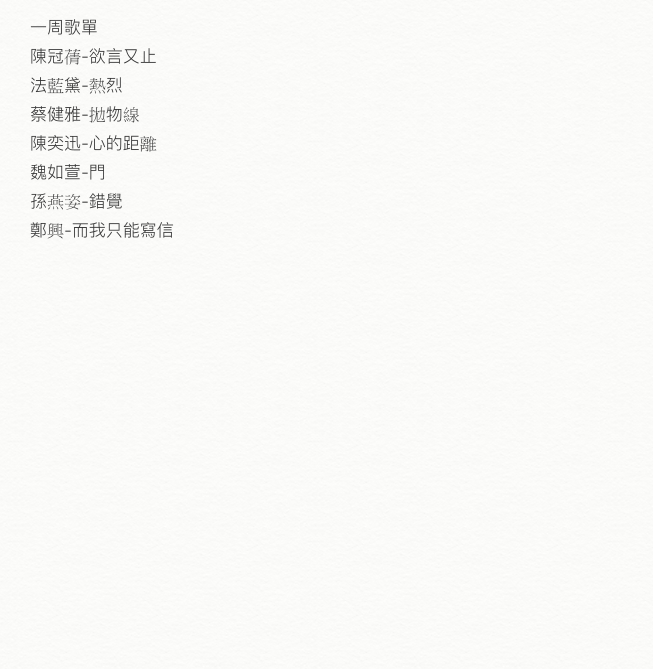 第一首歌:陳冠蒨-欲言又止,收錄於陳冠蒨2002年《欲言又止》專輯中,第一次聽到這首歌估計已經是2013年左右了,魏如萱在翻譯的女人這場演唱會中翻唱了這首歌,印象很深刻,因為當時的我非常想去這場表演,但礙於一些不允許的原因去不了,waa抱病表演的那天,哀傷的歌都不自覺再上了一層灰。