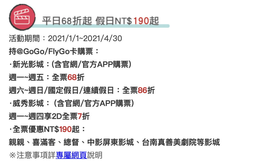 像電影打折這部分我也覺得是一個亮點,比如花旗信用卡只能在威秀影城享有優惠,但台新雙狗卡在新光、威秀甚至是其他戲院也享有優惠,對於喜歡看電影的人也是一大福音!