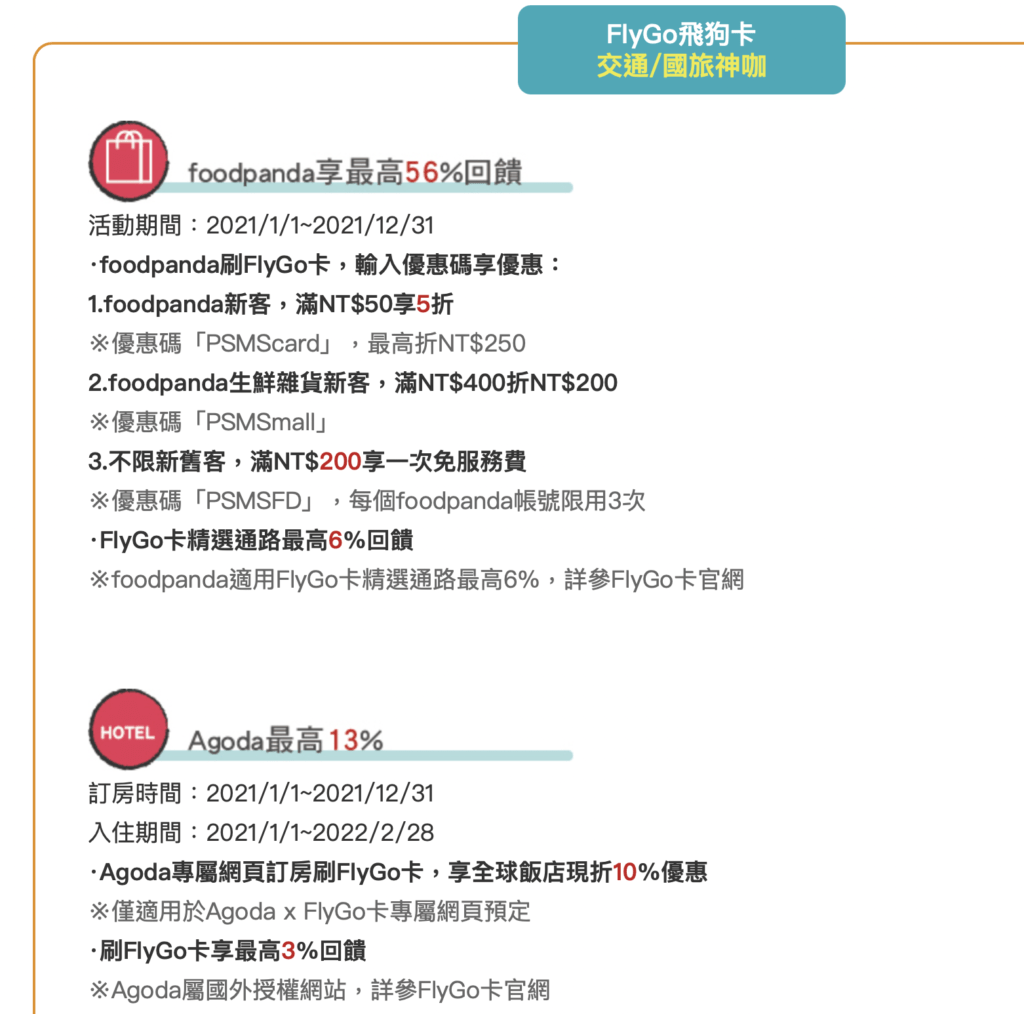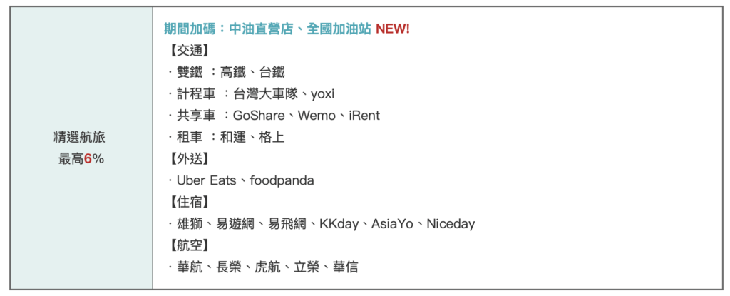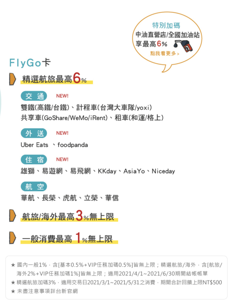 這次Fly Go卡的一大亮點是在加油的部分,在中油直營店或是全國加油站加油可以享有6%回饋,對於常常加油的人也是一大福音。