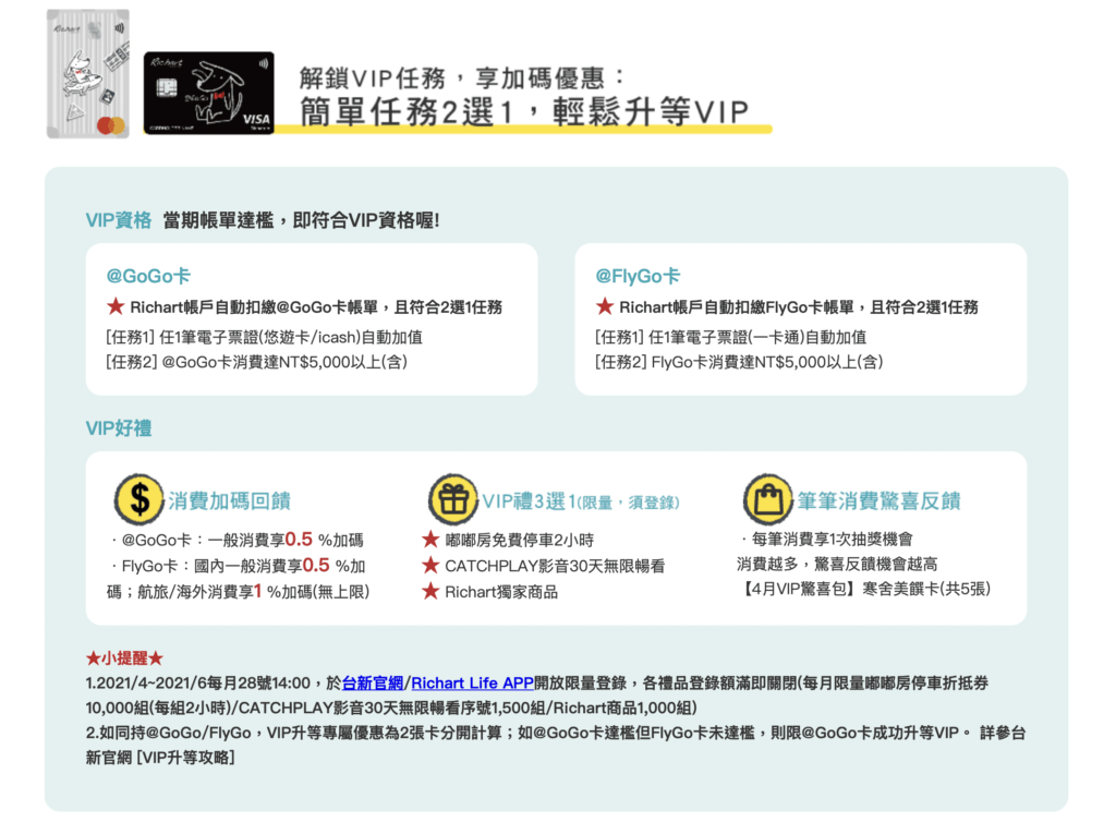 這次雙狗卡祭出了vip的制度,要符合資格並不困難,只要申請使用richart帳戶自動扣繳且消費達$5000或是電子票證的自動加值一筆就可以達到。