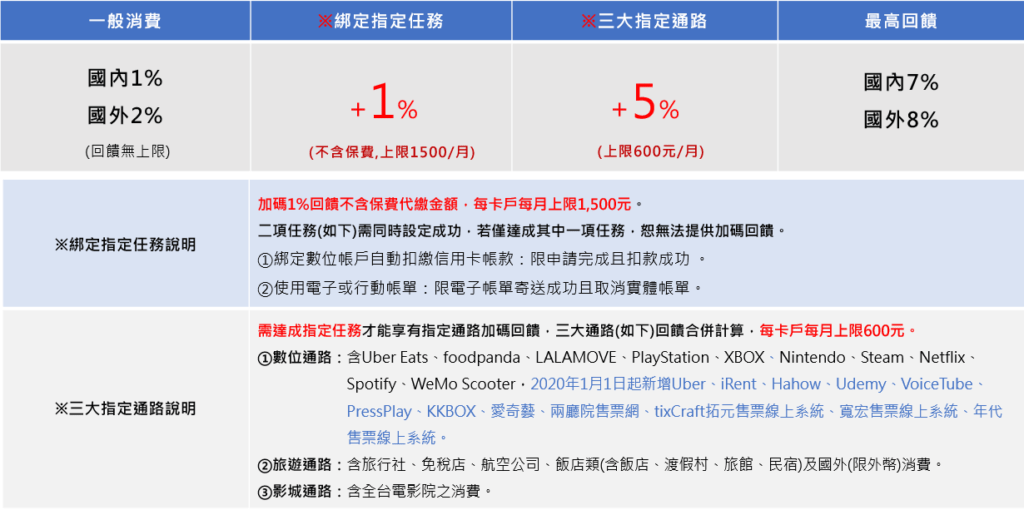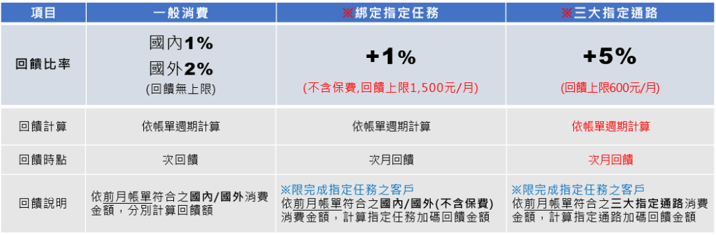 | 新戶禮 | 於核卡後30天內,刷3筆599元(含)以上享500元刷卡金回饋(限量) |