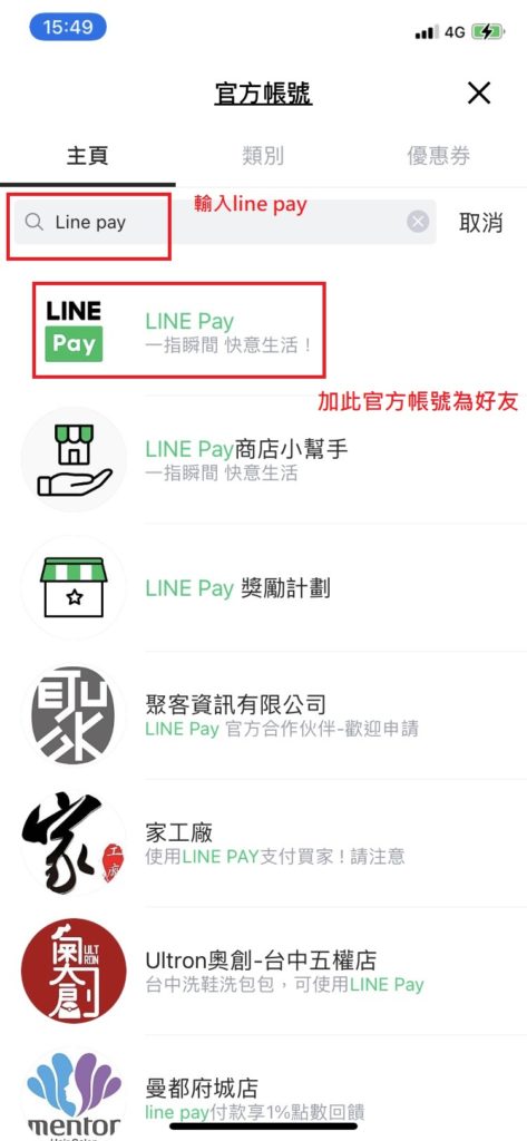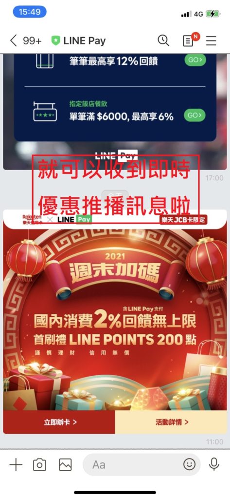 2.時常有優惠訊息,請參考下圖如何加line pay官方帳號為好友,消費時使用line pay / money得到更多回饋(通常line pay還可以再加乘原本信用卡的提供的回饋)