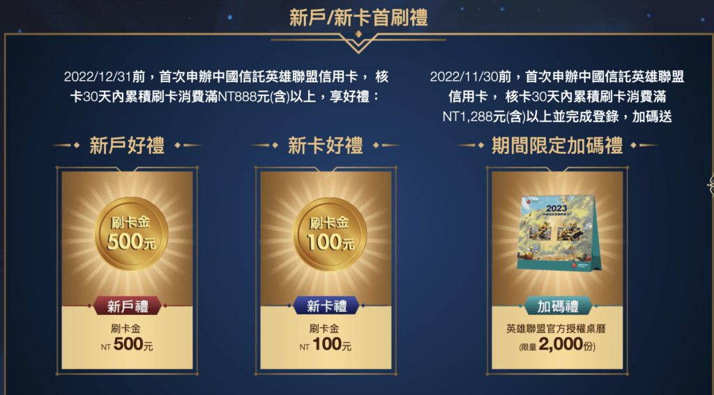 新卡定義: 限首次申辦中國信託英雄聯盟卡信用卡正卡者。