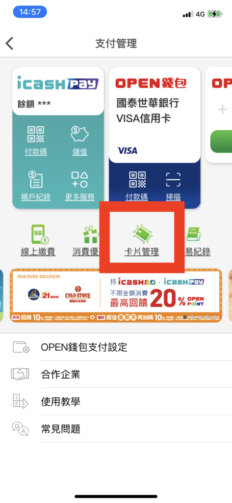 路徑為openpoint > 付款碼 > 支付管理 > 卡片管理,就可以開始綁定信用卡,銀行帳戶則可以選icash pay的儲值,來新增銀行帳戶。
