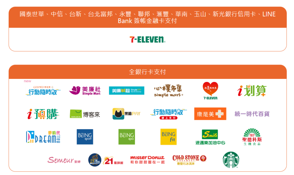 綁定卡種7-11限用:國泰世華、中信、台新、台北富邦、永豐、聯邦、滙豐、華南、玉山、新光銀行信用卡、LINE Bank 簽帳金融卡支付。
