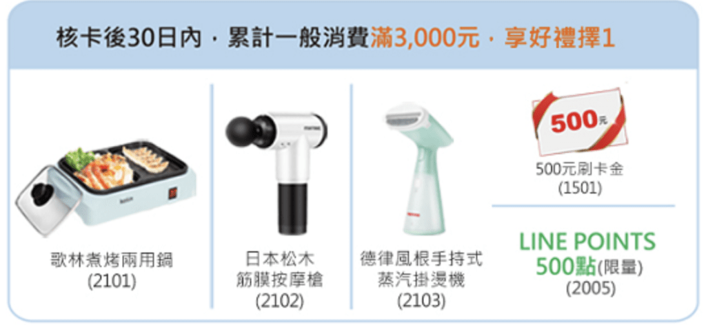 核卡30天內一般消費滿3,000元享首刷禮擇1