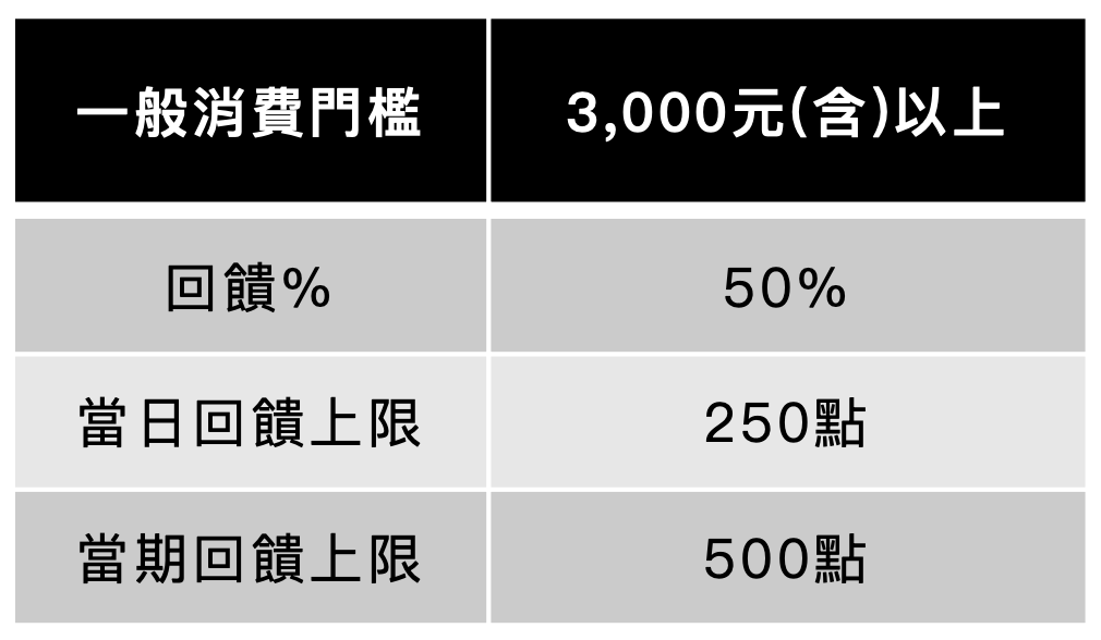 - 當期回饋上限150點👉當月最高消費上限為300元