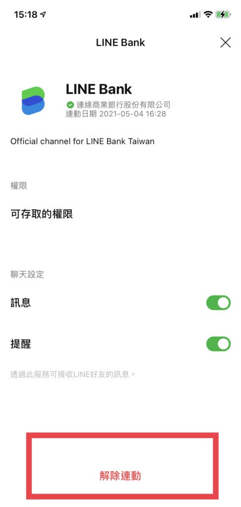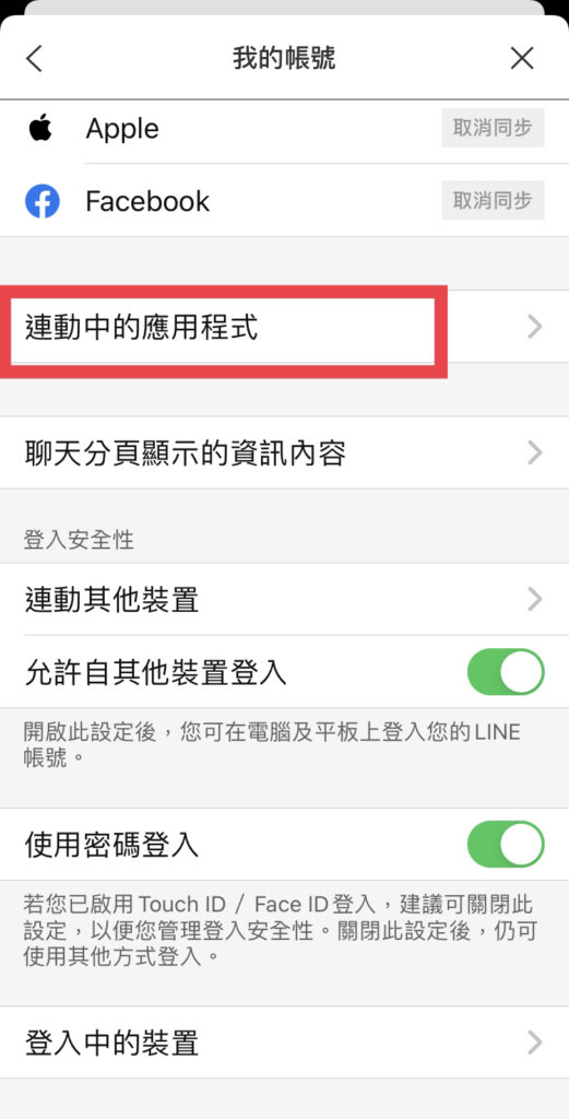 3.回到Line主頁>設定>帳戶>已連動的應用裝置>line bank解除綁定