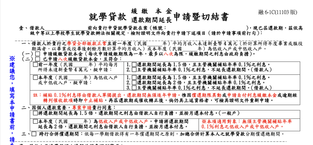 🔎檔案下載路徑:臺銀就學貸款入口網->表單下載->申請書下載->就學貸款緩繳本金及還款期間延長申請暨切結書