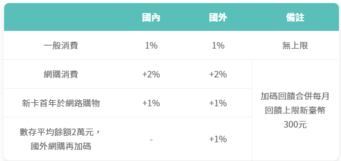 這張圖簡單來說就是一般消費1%,但假設你是在**網路購物,首年最少都有國內外4%,國外消費若還有開立數位帳戶(平均餘額達2萬)則享5%**的優惠。