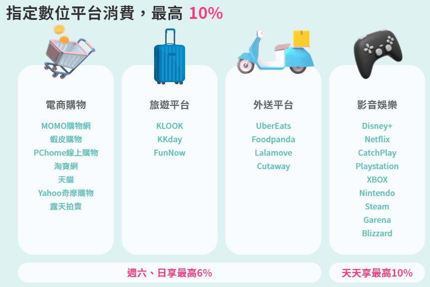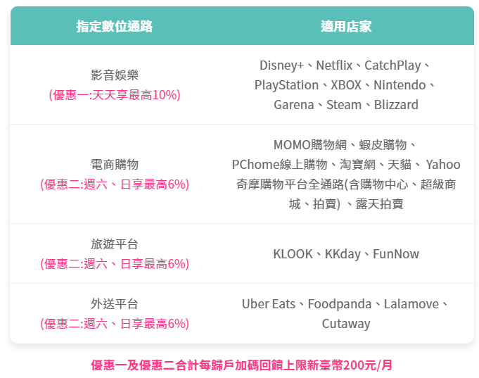 指定數位通路消費最高10%現金回饋【含原卡片回饋國內最高4%,國外最高5%;即指定影音/娛樂加碼最高6%;指定電商/外送/旅遊加碼最高2%】,正、附卡合併計算,優惠一及優惠二合計每歸戶加碼回饋上限新臺幣200元/月,與原卡片每月加碼回饋上限新臺幣300元分開計算。