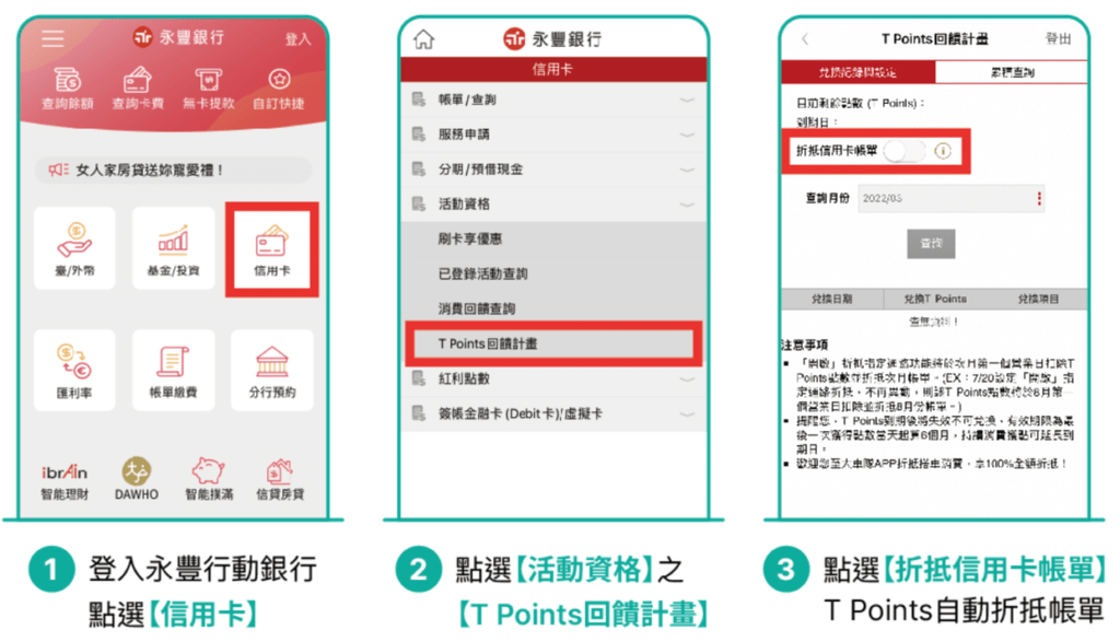 如何折抵信用卡帳單:永豐銀行app->信用卡->T points回饋計畫->折抵帳單