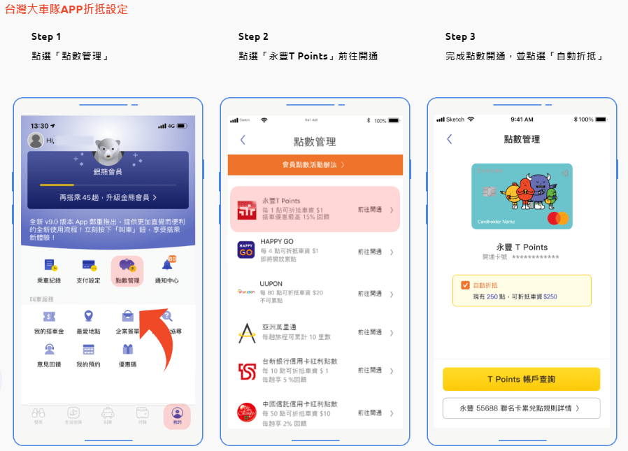 如何在搭車時折抵車資:台灣大車隊app->點數管理->永豐T points開通->自動折抵