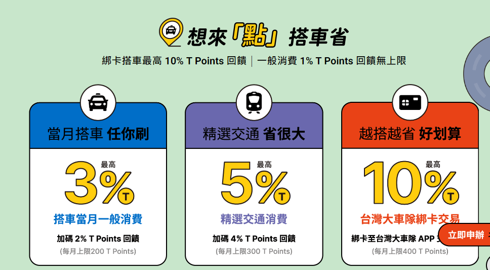 本張信用卡回饋的是T points(1點=1元),但這不需要多記,只需要知道可以折抵帳單跟台灣大車隊的車資就好**。**