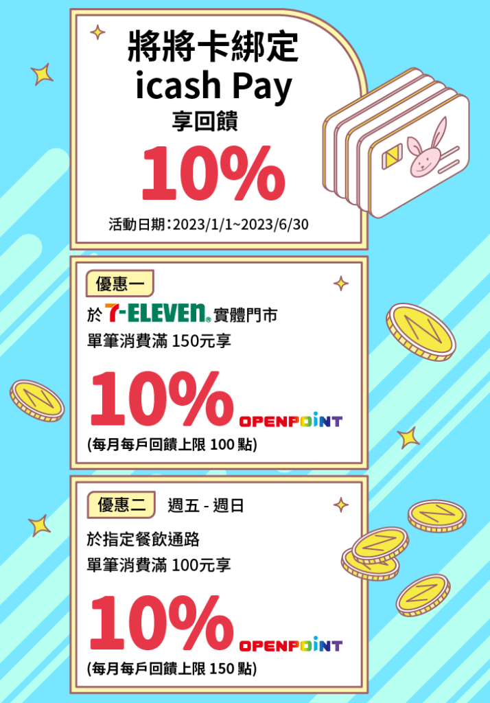 以將來銀行簽帳金融卡綁定icash Pay,至7-ELEVEN實體門市單筆消費150元(含)以上,可獲得OPEN POINT點數10%回饋。(每戶每月回饋上限100點)
