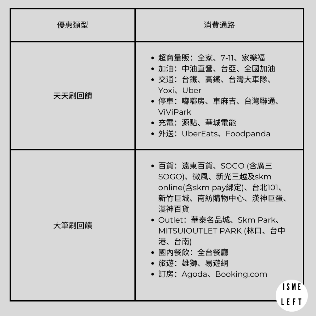 但我覺得可以推薦給「消費通路」吻合度有70-80%,尤其是會有大筆消費的人!大筆消費還能拿到無上限回饋的話,就會差滿多的。