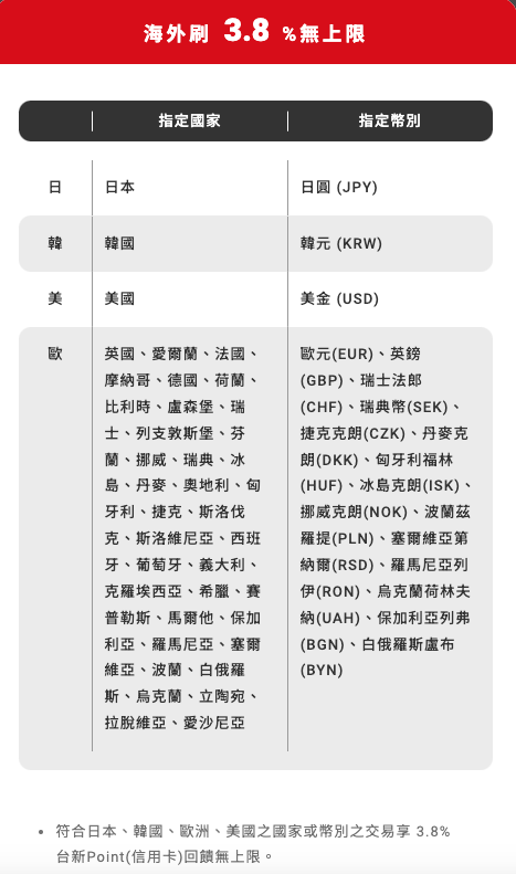 海外回饋在日、韓、歐、美都享有 3.8% 無上限的回饋。
