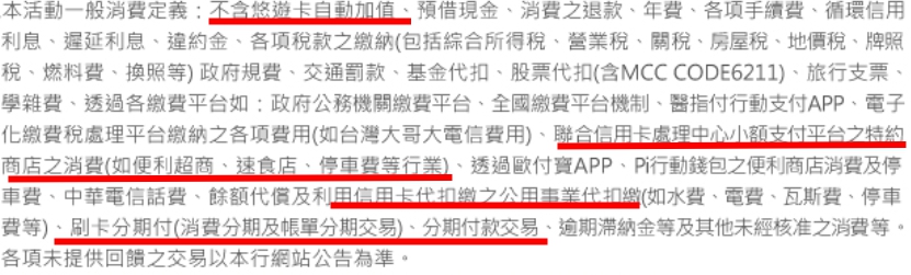 ⭐雖然要拿好拿滿要刷的上限並不高,我覺得一般人在生活用品、一般起居都是很夠用的,而在其他方面數位影音或外送就有更推薦的卡了,所以就依照自己自身消費習慣來選就好。